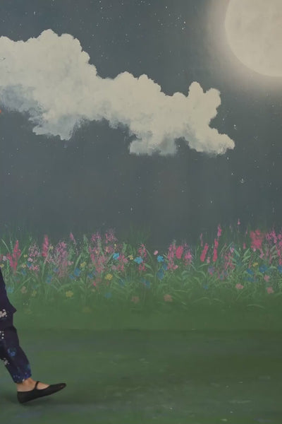 A fascinating midnight blue set in linen, is inspired by the Morning Glory, a flower known for its poetic bloom at daybreak. It celebrates renewal, grace, and the gentle unfolding of a new beginning. The deep backdrop acts like a night sky just before sunrise—intensifying the flower’s pastel radiance and allowing each bloom to glow with quiet luminosity.