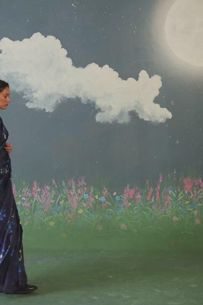 A fascinating midnight blue sari, in handwoven mulberry silk and an intricate embroidered border, is inspired by the Morning Glory, a flower known for its poetic bloom at daybreak. It celebrates renewal, grace, and the gentle unfolding of a new beginning. The deep backdrop acts like a night sky just before sunrise—intensifying the flower’s pastel radiance and allowing each bloom to glow with quiet luminosity.