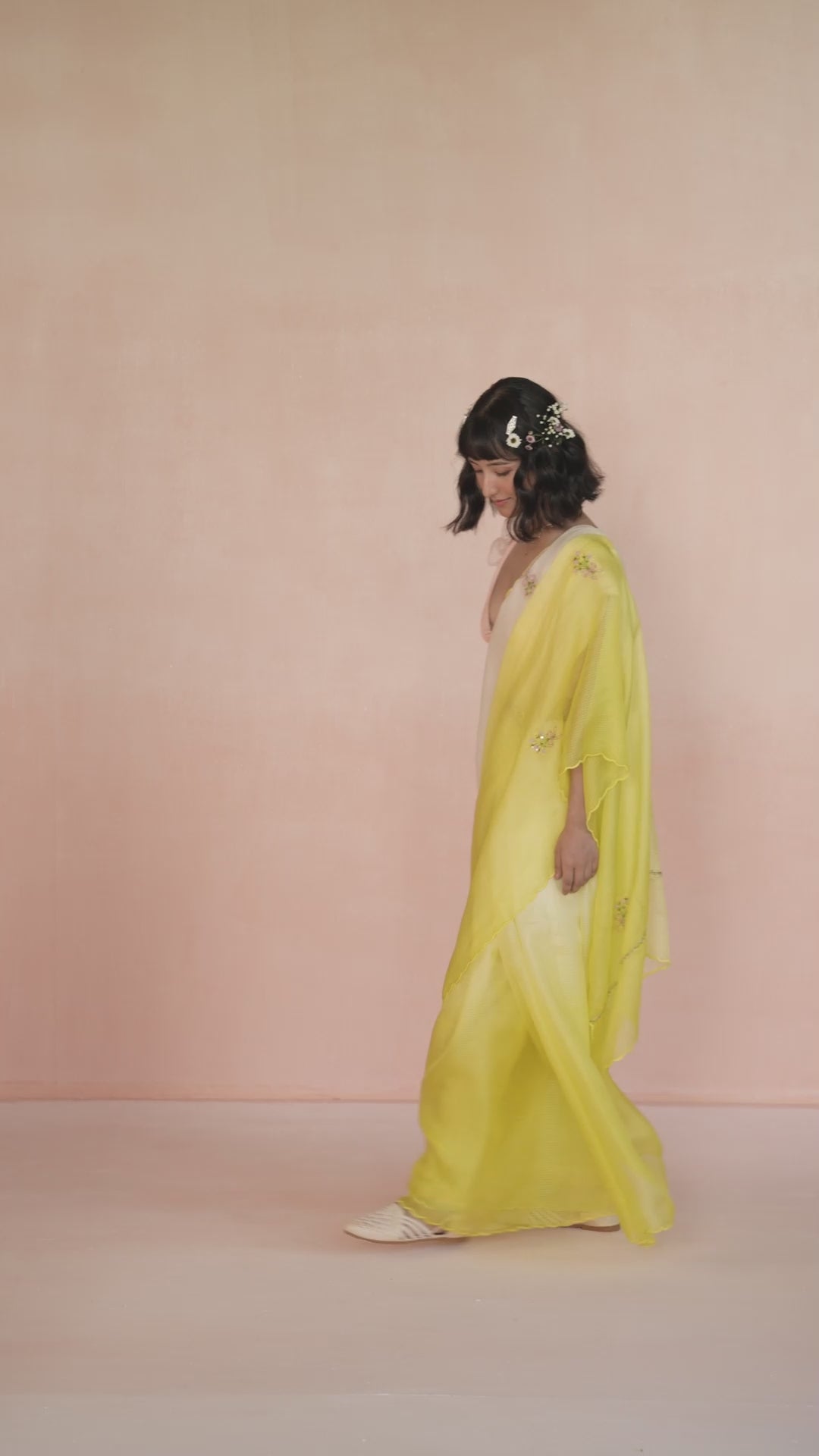 The Bouquet sari in handwoven Kota Doria Silk Yellow Ombre mirrors the journey of a sunlit day - starting with the soft, golden hues of early morning, gradually deepening into the bright, radiant yellow of midday, creating a warm, glowing radiance. Delicate hand embroidery along the pallu, hand embroidered flowers coupled with scalloped edges and beaded tassles make this a pièce de resistance.