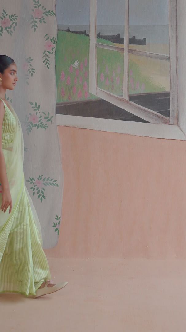 The exclusive green stripe jamdani sari in handwoven silk and organza is a deliberate, modern gesture on a traditional canvas. The green, bold yet harmonious, adds an element of design clarity and visual rhythm, lending the sari a distinctive identity and offering a refined edge to classic form. Each piece is one-of-a-kind and meticulously crafted over weeks, weaving motifs into works of art by master artisans. This sari creates an ethereal texture — feather-light, sheer, and luminous with motifs that appear to float on the surface. This is an epitome of elegance and heritage in your wardrobe.