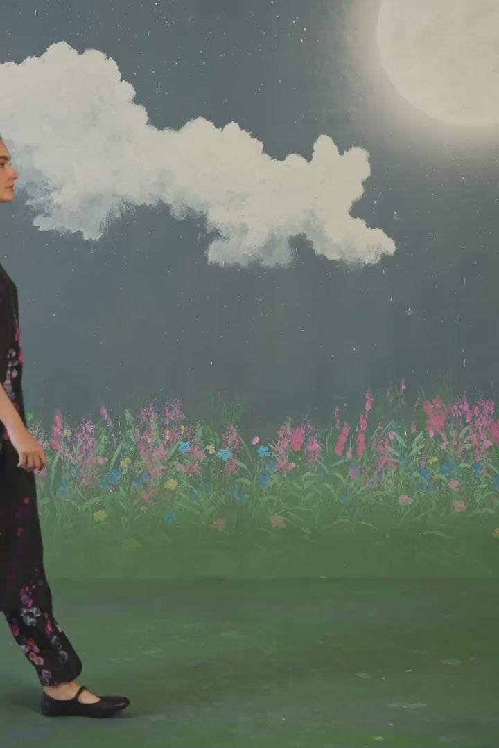 Foxglove, in a long kurta set in bamboo silk, with its tall, cascading bloom brings a sense of graceful movement and sculptured beauty. The deep background creates a striking contrast that accentuates every petal, contour and cascading cluster, making it stand apart in a world of familiar florals.
