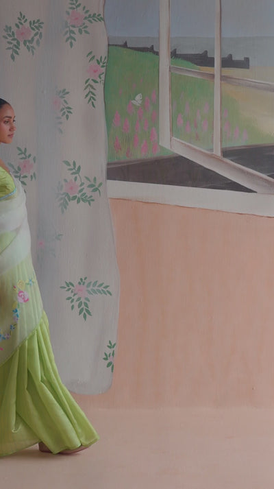 The exclusive half off-white, half green jamdani sari in handwoven silk and organza is a duality of grace and presence that creates a visual balance between restraint and sophistication. Each piece is one-of-a-kind and meticulously crafted over weeks, weaving motifs into works of art by master artisans. This sari creates an ethereal texture — feather-light, sheer, and luminous with motifs that appear to float on the surface. This is an epitome of elegance and heritage in your wardrobe.