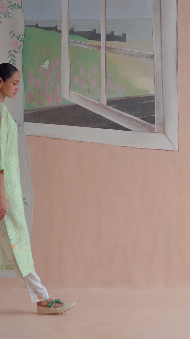 Green Checks and mallow flower long kurta set in handwoven mulberry silk alludes to a romance of checks with mallow flowers from Kashmir Valley. A reimagined classic checks with a poetic twist. Gathered blooms appear almost alive in contrast to the grid of checks. A relaxed fit, it offers ease and comfort while maintaining elegance. The kurta drapes fluidly, complemented by coordinating trousers that complete the look with grace.