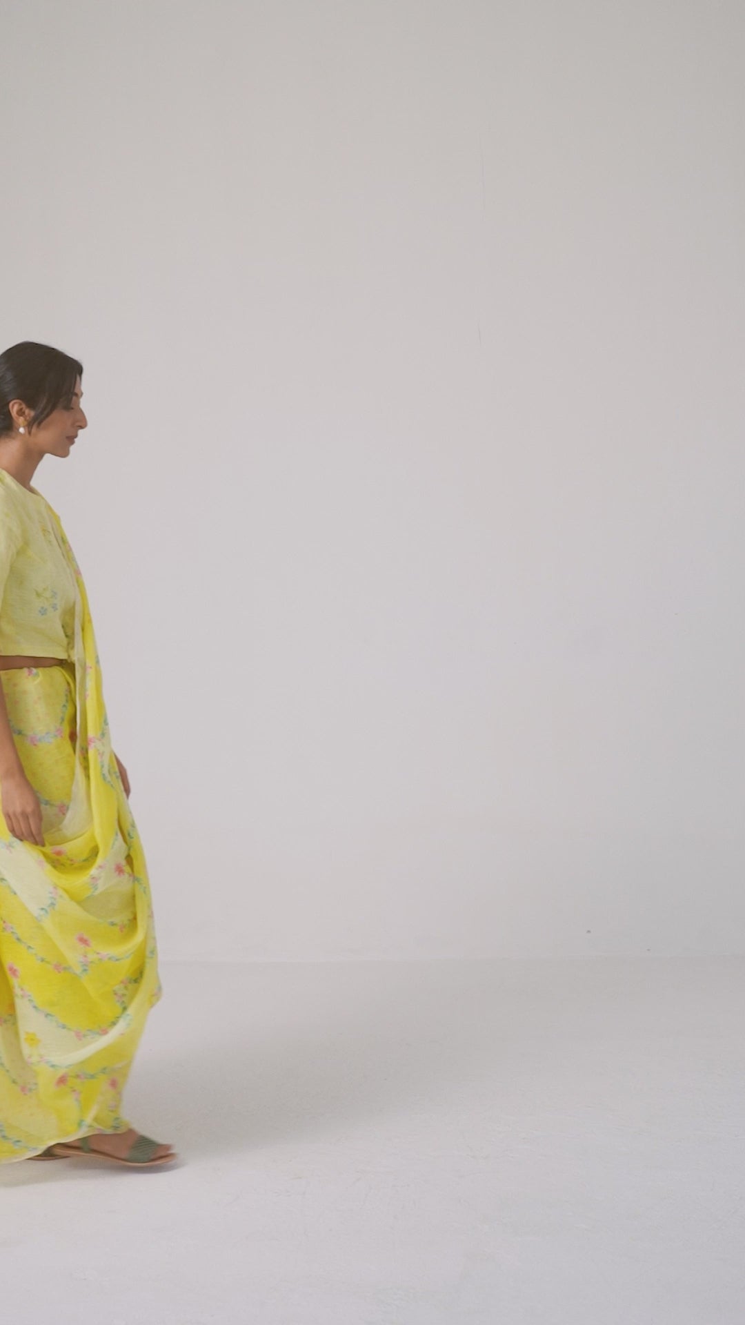 Dainty blooms from the valley of Kashmir are reimagined and placed in elaborate scallops over this Linen sari. Aptly named Gulmarg, it weaves a rich tapestry of handwoven fabrics and floral prints. Luxurious to wear and pleasing to the eye, the yellow Linen sari drapes as snugly as a sari can and yet is breezy to move around in. Comes with running blouse piece.