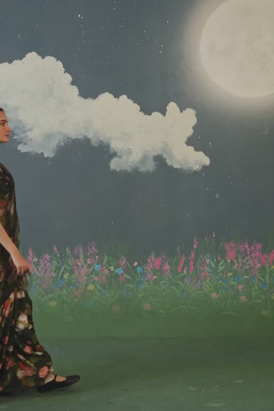 Lotus on handwoven mulberry silk and silk organza sari, is one of the most distinctive and meaningful floral motifs in design. Known for its serene elegance and graceful petals, it symbolizes purity, resilience, and inner beauty. It creates a bold yet graceful pattern that feels both contemporary and deeply rooted in cultural artistry. The dark base colour acts as a dramatic canvas, allowing the lotus to bloom with heightened vibrance and clarity.