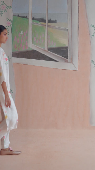 Poppy with checks long kurta set in handwoven mulberry silk embodies the elegance of craft refined through detail. Delicate checks introduce rhythm and geometry. Against this measured grid, scattered poppy flowers bloom with spontaneity, their vivid presence adding vibrance. A relaxed fit, it offers ease and comfort while maintaining elegance. The kurta drapes fluidly, complemented by coordinating trousers that complete the look with grace.