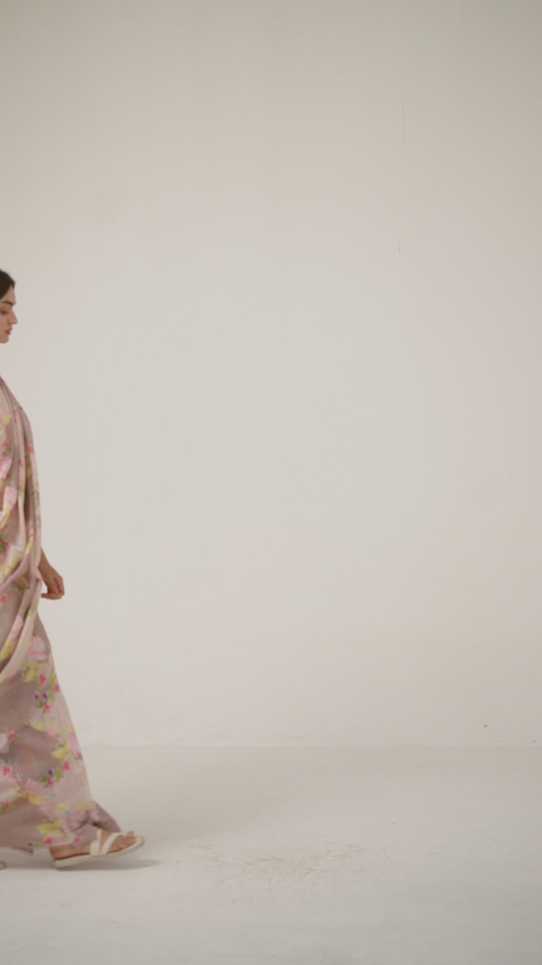 A rose in any hue and form is as magical. The rose trellises of gardens of Kashmir reimagined on earthy hued chanderi make it a love at first sight sari. Wildflowers infused in the lattices of pink roses, this cotton silk drape keeps in place as you move around. The english countryside inspired pink checks blouse and beaded tassels on the sari add to the overall charm. Hand hemmed to perfection it is a piece you will cherish for years. Comes with pink checks silk blouse piece.