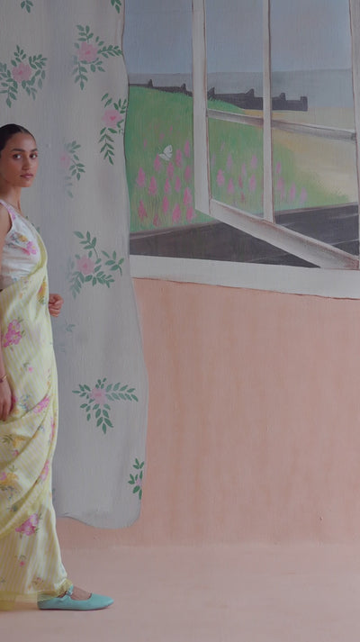 Yellow stripe sari in handwoven mulberry silk is joyful yet composed, and a radiant expression of contemporary elegance rooted in craft. The off-white floral print blouse lends a soft contrast that brings textural and visual interplay to the look. Thoughtfully designed and intricately finished embroidered, scalloped edge introduce texture, movement, and definition—elevating the sari from simply beautiful to exceptionally crafted. The naturally lustrous silk drapes with effortless fluidity, making it the perfect union of tradition and modern detailing.