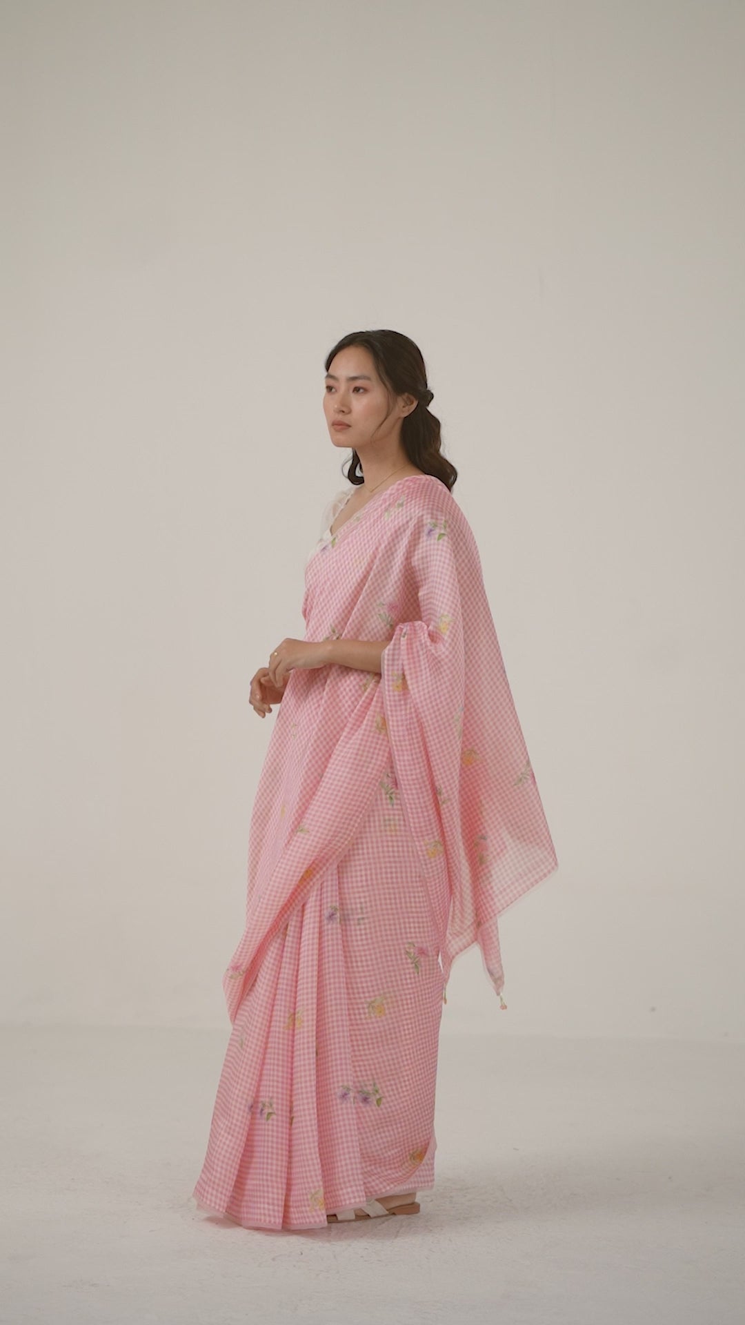 A romance of pink checks on wispy Organza with flowers from the Kashmir valley sprinkled all over, ensures a cottagecore fit. The handwoven fabric feels effortless through fingers as you pleat it neatly and dress up for the day. Paired with a silk blouse this hand hemmed and tasselled beauty speaks the love language of wearing handmade. Comes with with printed Silk blouse piece.