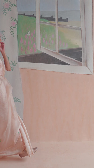 The exclusive peach jamdani sari in handwoven silk and organza has a distinct interpretation of florals. Peach colour gives this piece a distinct individuality — soft yet striking, refined yet unmistakably unique. The peach colour is a result of extraordinary patience and precision. Each piece is one-of-a-kind and meticulously crafted over weeks, weaving motifs into works of art by master artisans. The peach jamdani sari creates an ethereal texture — feather-light, sheer, and luminous with motifs that appear to float on the surface. This is an epitome of elegance and heritage in your wardrobe.