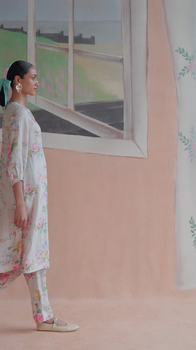Beige floral bouquet long kurta set in 100% linen is a portrait of understated elegance, with a silhouette that balances refinement and ease. The bold, gathered blossoms create a statement of presence and femininity, with an artistry that feels timeless and contemporary. This comfort-first silhouette is elevated by its poised proportions. A relaxed fit and crafted from linen, the fabric lends grace and form to the silhouette. Meticulous hand-finishing adds a touch of individuality. Pockets for convenience.