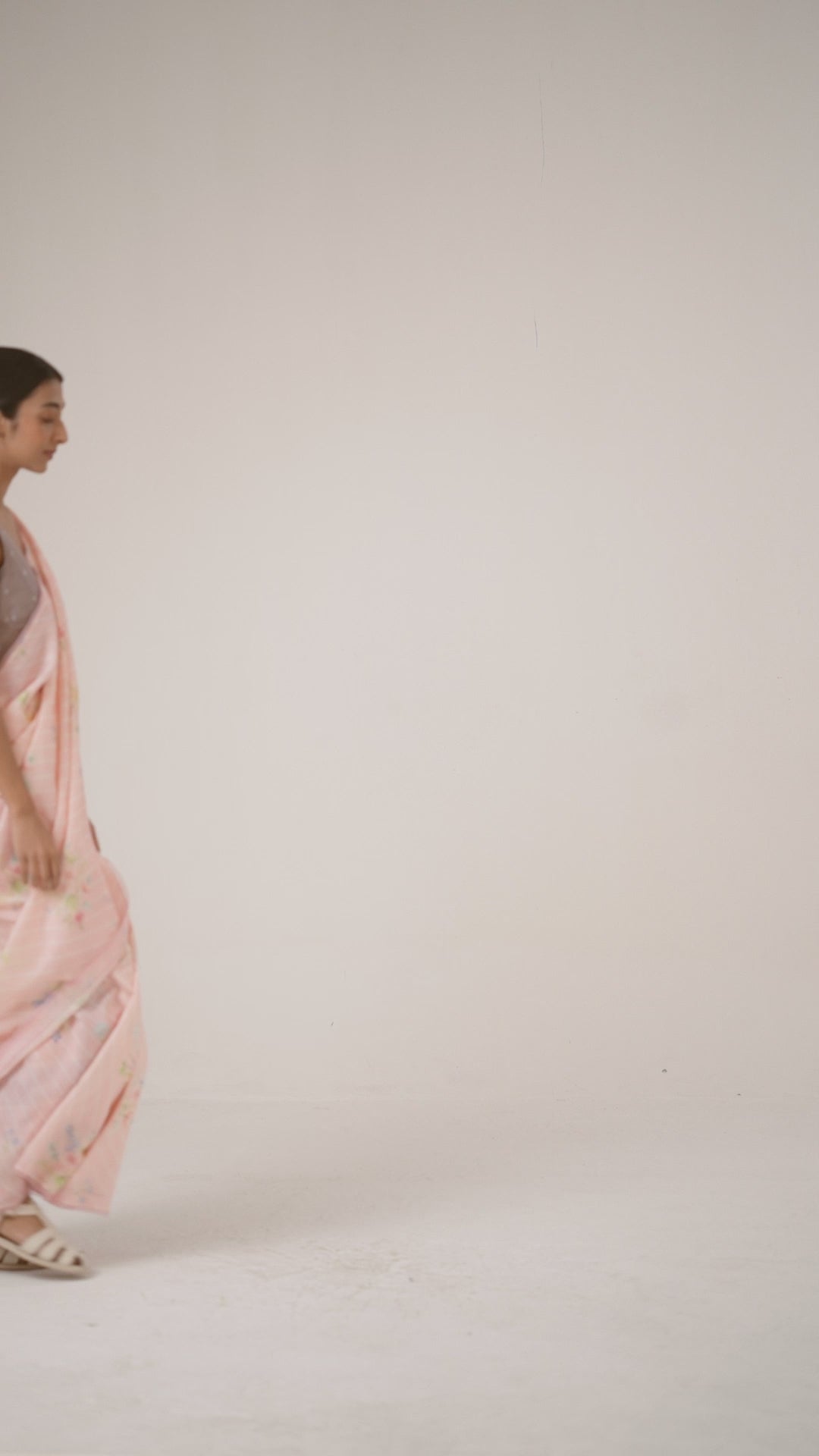Flowers from the valley of kashmir are tied in whimsical bunches and spread across this hand-hemmed sari. Beaded tassels add to its charm as they nod to the passer-bys with each movement. A blush hued sari for soirees and more, this drape is a romance of stripes with blooms. Easy to pleat and breezy to walk around in, its handwoven blend of silk and cotton chanderi makes it a wardrobe staple for all seasons. Comes with floral print silk blouse piece.