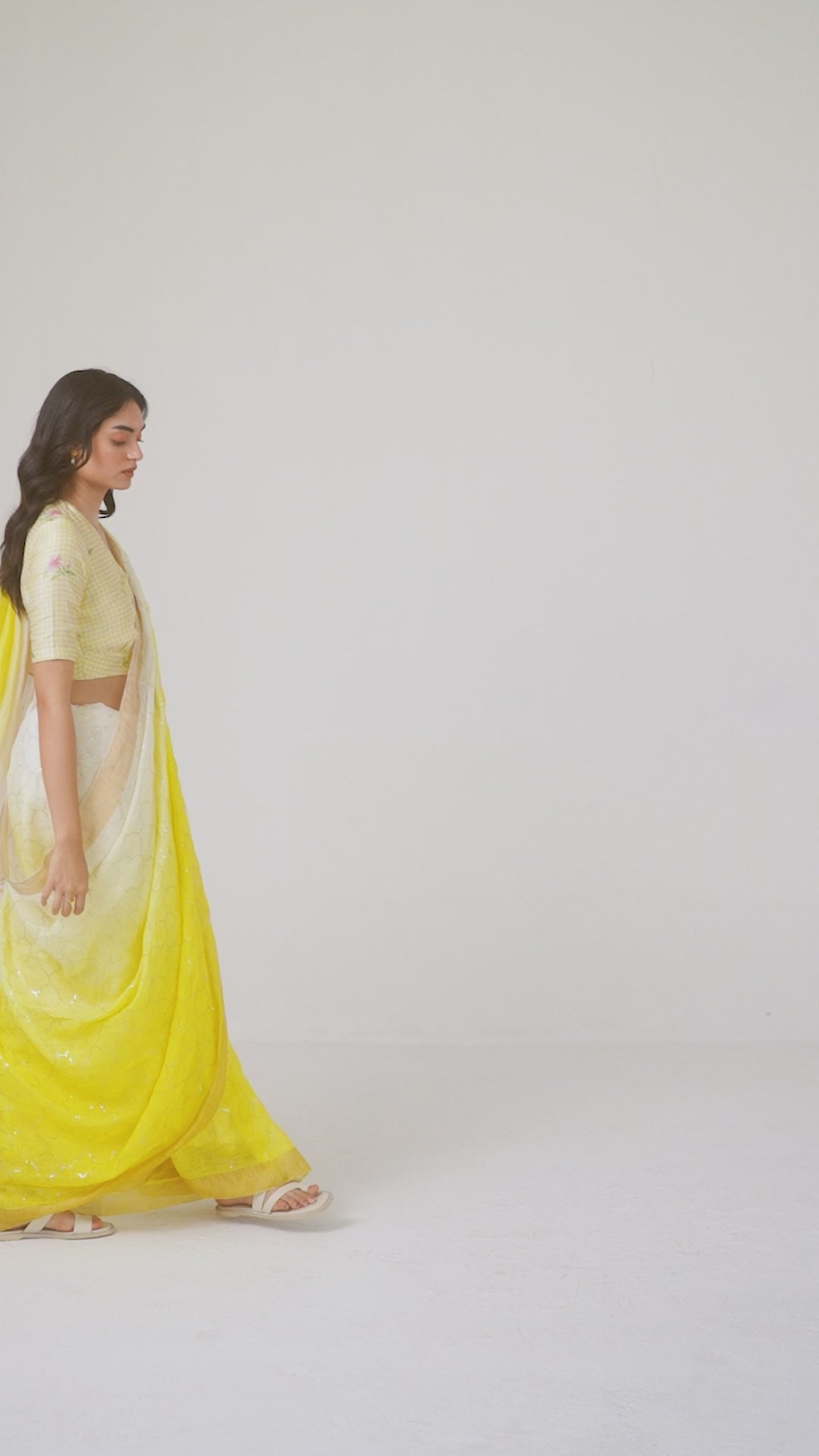 Handwoven Linen Sari with Gold Border and running blouse piece with gold dots print